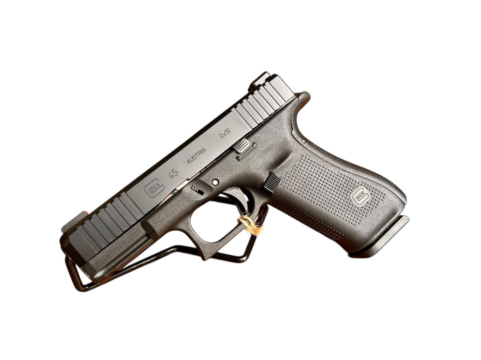 Czym Glock 45 różni się od Glocka 17 i 19? Glock 45 to hybryda: posiada pełnowymiarowy szkielet i chwyt od Glocka 17 (co daje pewny chwyt i dużą pojemność magazynka) oraz kompaktowy, krótszy zamek i lufę od Glocka 19 (co poprawia wyważenie i szybkość dobycia broni).