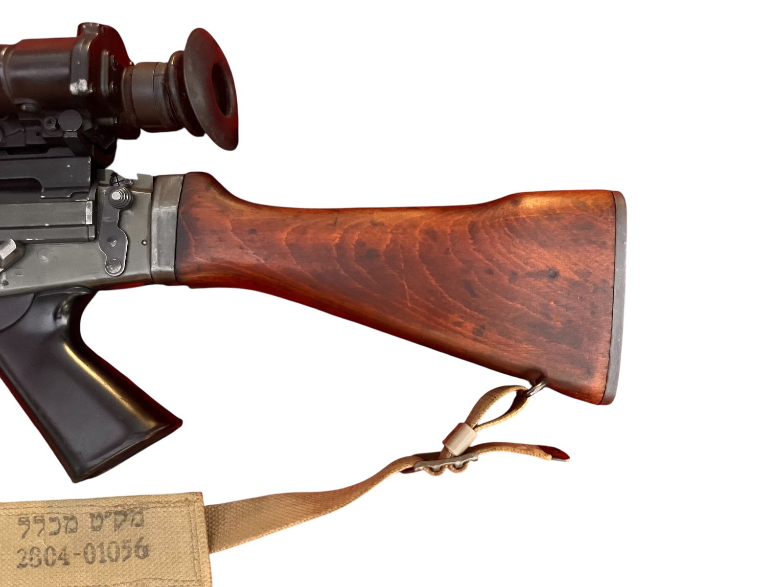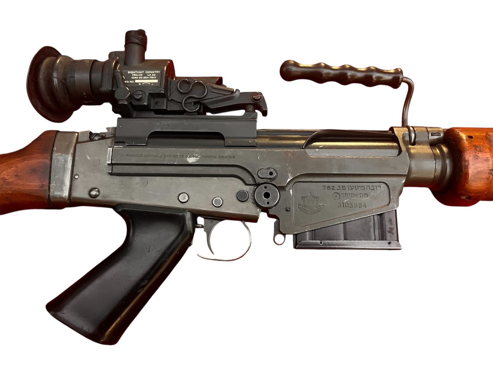 Ten egzemplarz to nie tylko w pełni funkcjonalny karabin samopowtarzalny, ale przede wszystkim namacalny kawałek historii wojskowości. Hebrajskie oznaczenia są dowodem jego służby w IDF. Dołączony celownik optyczny Sightunit Infantry Trilux (SUIT) L2 A2 to klasyk, który idealnie komponuje się z karabinem, tworząc zestaw prosto z pola walki lat 70. i 80. To broń dla prawdziwego konesera.