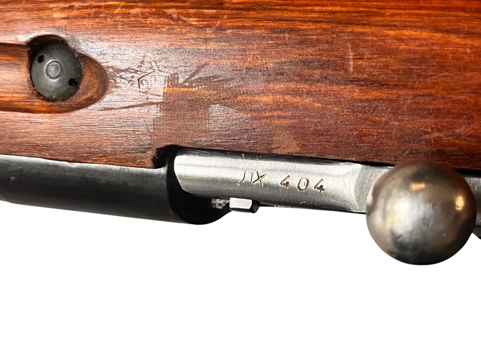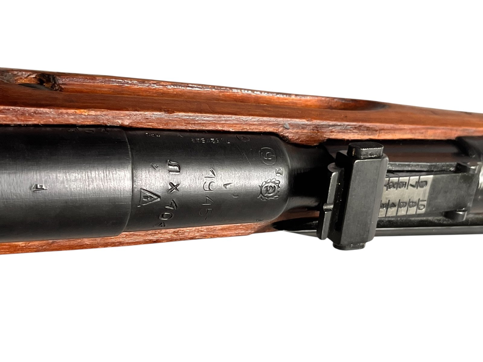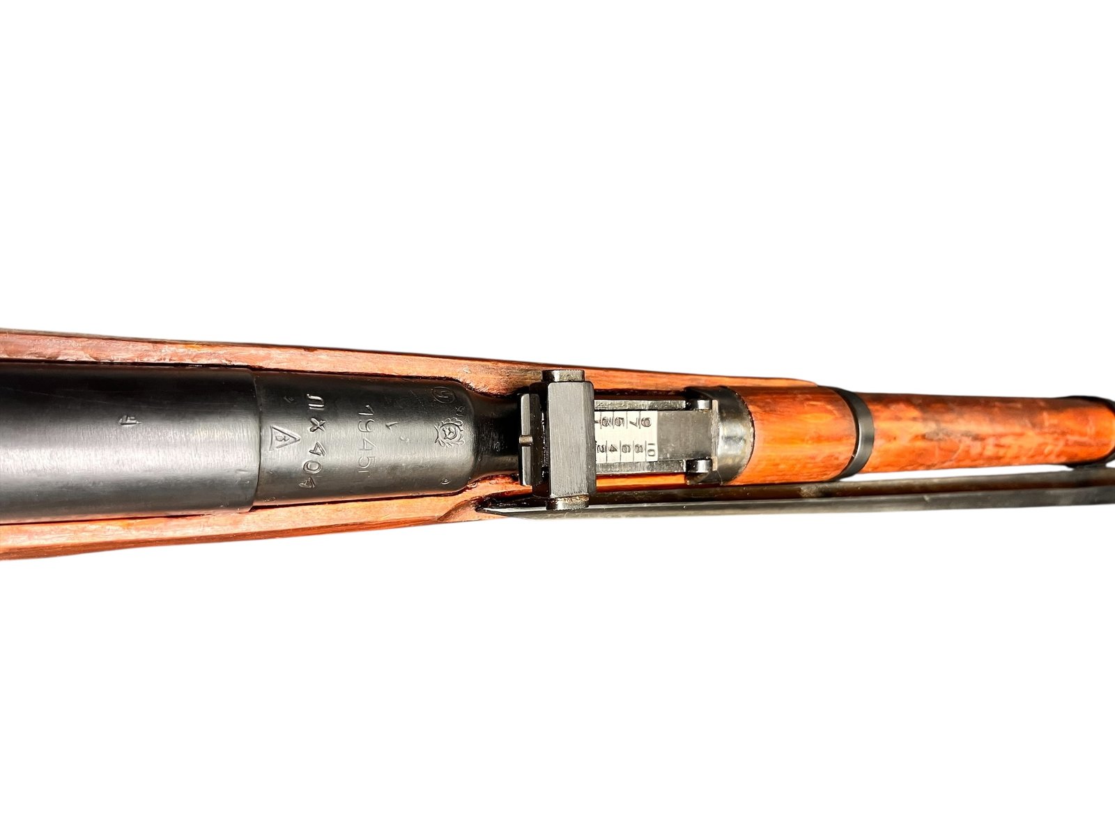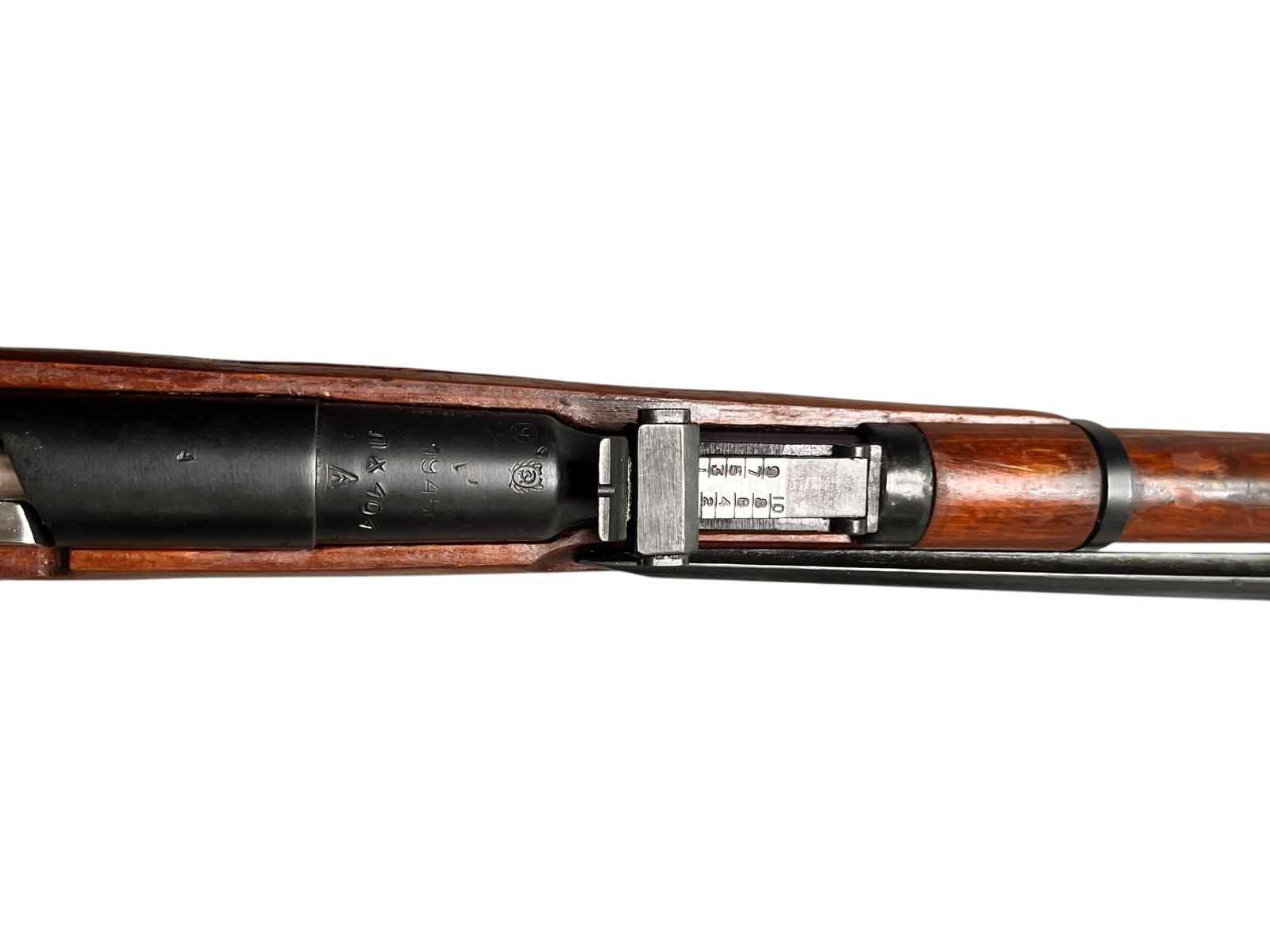 Prezentowany Mosin-Nagant M44 z 1945 roku to radziecki karabin powtarzalny, wyprodukowany w renomowanych zakładach Izhevsk. Model M44, wprowadzony do służby w 1944 roku, stanowił rozwinięcie wcześniejszego modelu M38, wzbogaconego o stały, składany bagnet. Egzemplarz ten charakteryzuje się zgodnością numerów seryjnych oraz bardzo dobrym stanem lufy i zamka. Drewniana kolba wykazuje ślady użytkowania, typowe dla broni z tego okresu.