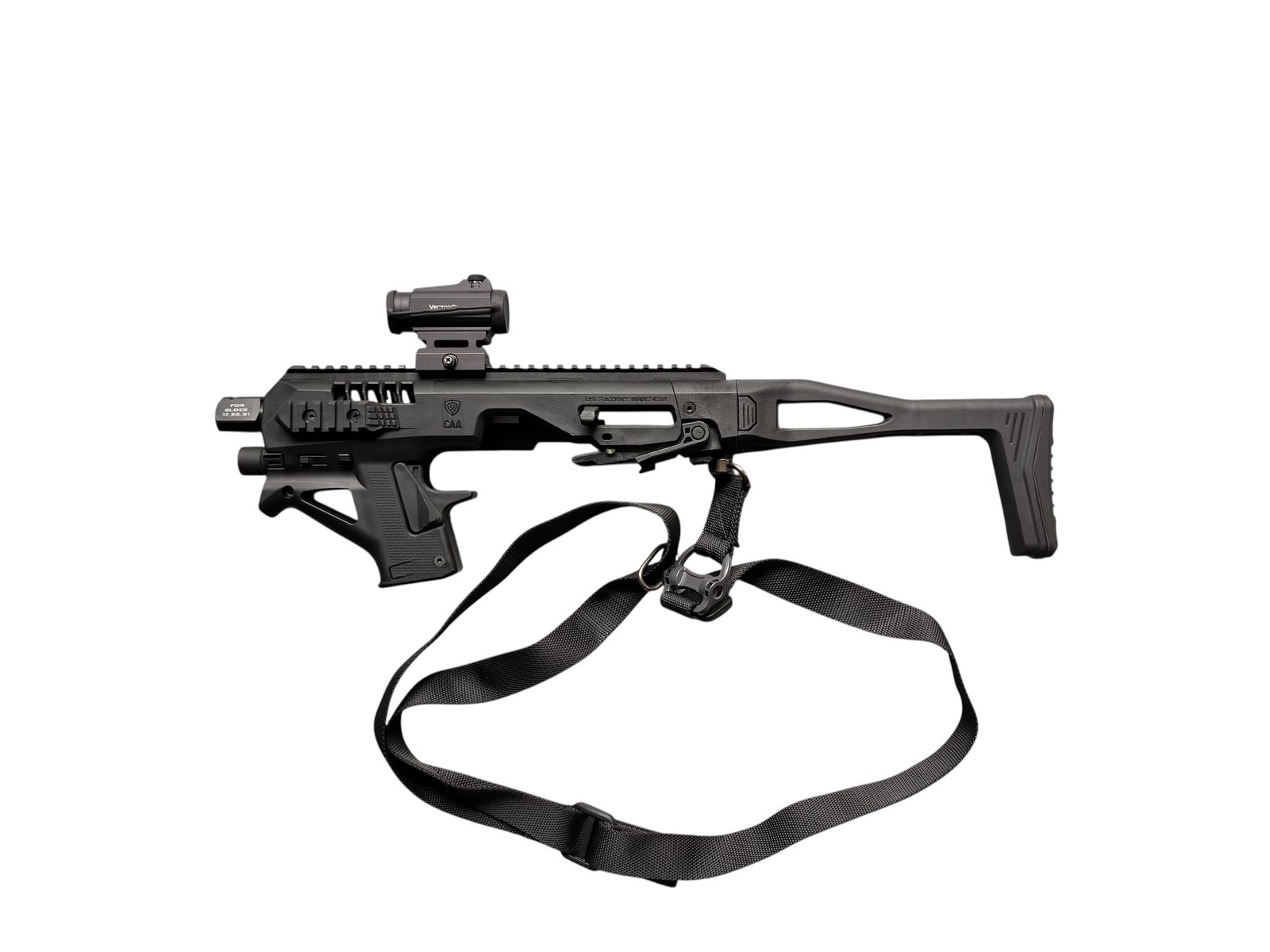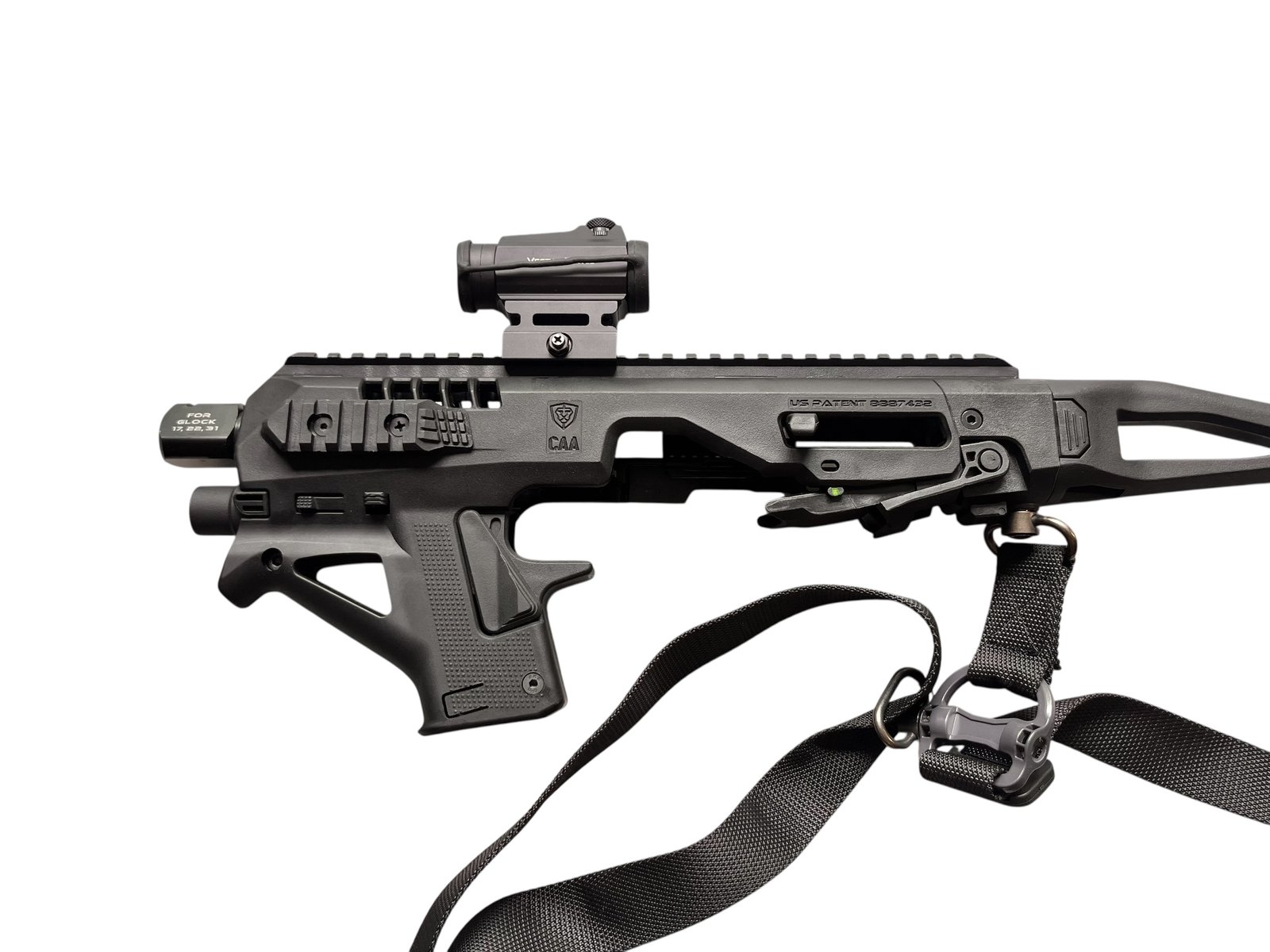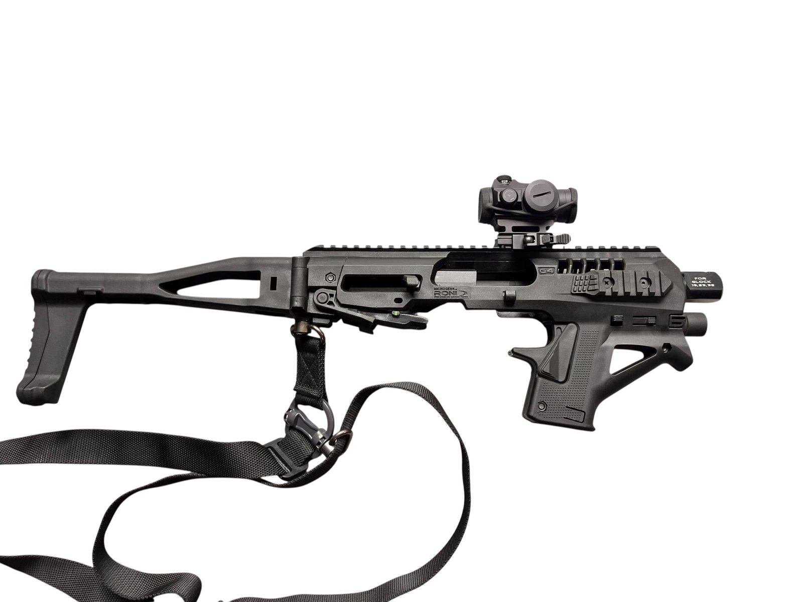 Micro Roni Gen 4 do Glocka (Gen 4) to zaawansowany zestaw konwersyjny, który w kilka sekund przekształca standardowy pistolet w kompaktowy karabinek, oferując dużą stabilność i opcję montażu akcesoriów. Egzemplarz w stanie bardzo dobrym, w zestawie z dodatkowymi akcesoriami: pasem oraz kolimatorem.