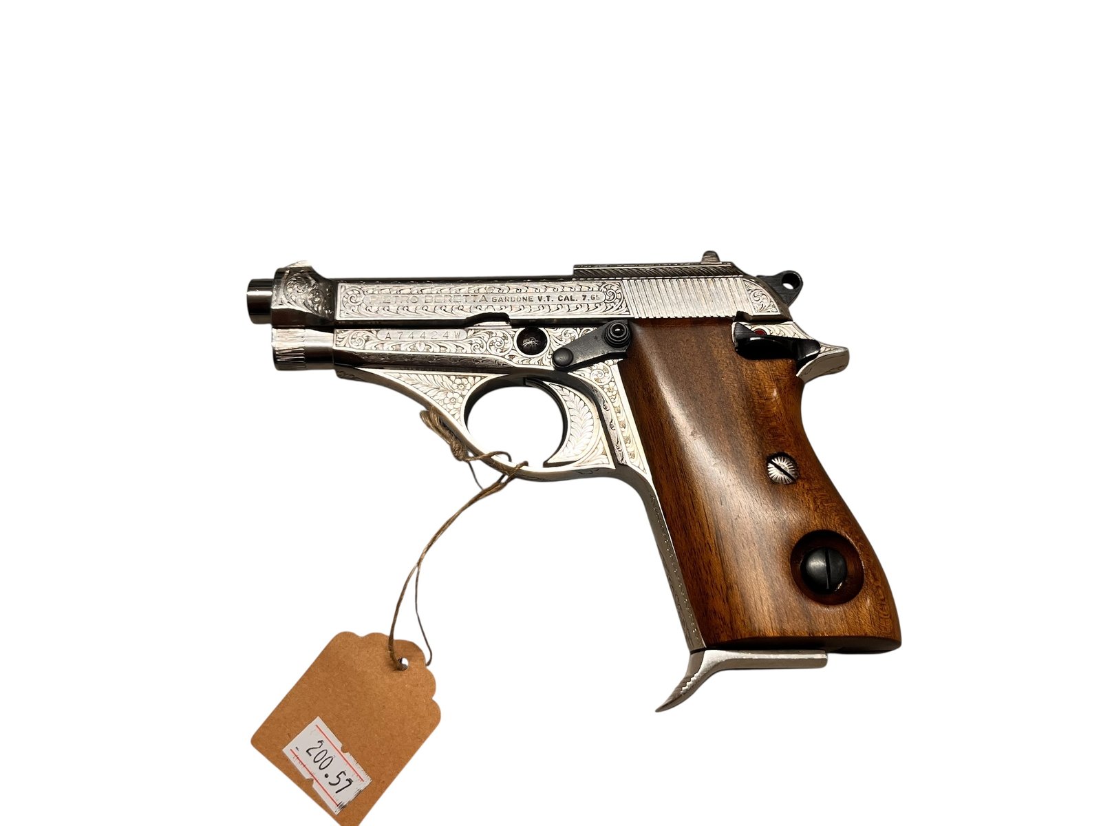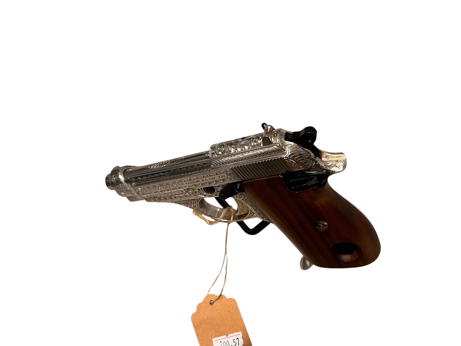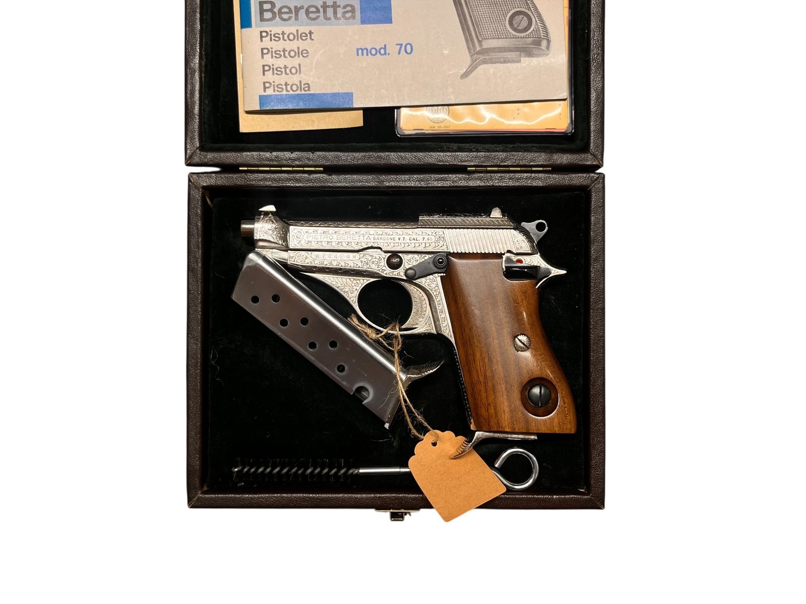 Beretta 70 Luxus to pistolet o ugruntowanej renomie. Standardowe wersje tej broni były używane m.in. przez włoskie służby, a także przez agentów izraelskiego Mossadu, co świadczy o ich niezawodności i skuteczności. Oferowany egzemplarz to jednak coś znacznie więcej. Wersja Luxus była tworzona na specjalne zamówienie i stanowiła pokaz możliwości fabryki. Ręcznie naniesione grawerunki o motywach roślinnych pokrywają zamek i szkielet, a całość jest wykończona z dbałością o najdrobniejszy detal. Pistolet z 1974 roku, zachowany w takim stanie i z pełnym zestawem, to pewna lokata kapitału i unikat, który będzie ozdobą każdej zaawansowanej kolekcji broni palnej.